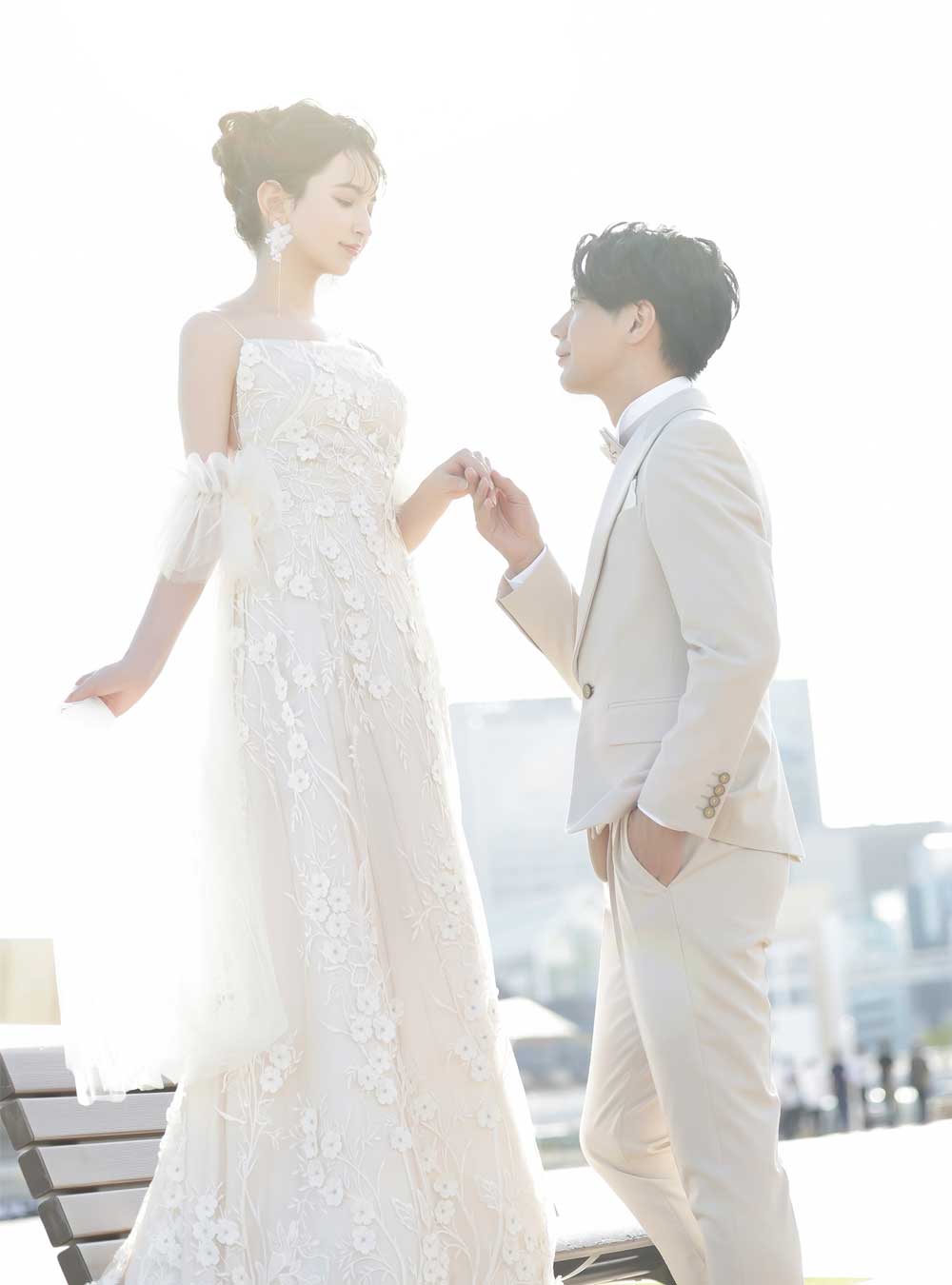 優美でロマンティックな一着です。全体に散りばめられた花模様の刺繍が繊細で可憐な印象を与えてくれます。ボリュームのあるふわりとしたチュールのオフショルダーデザインはデコルテラインを美しく見せてくれ、清楚でありながらも華やかさを兼ね備えています。流れるようなシルエットのスカートは歩くたびに優雅に揺れ動き、気品のある雰囲気を醸し出します。