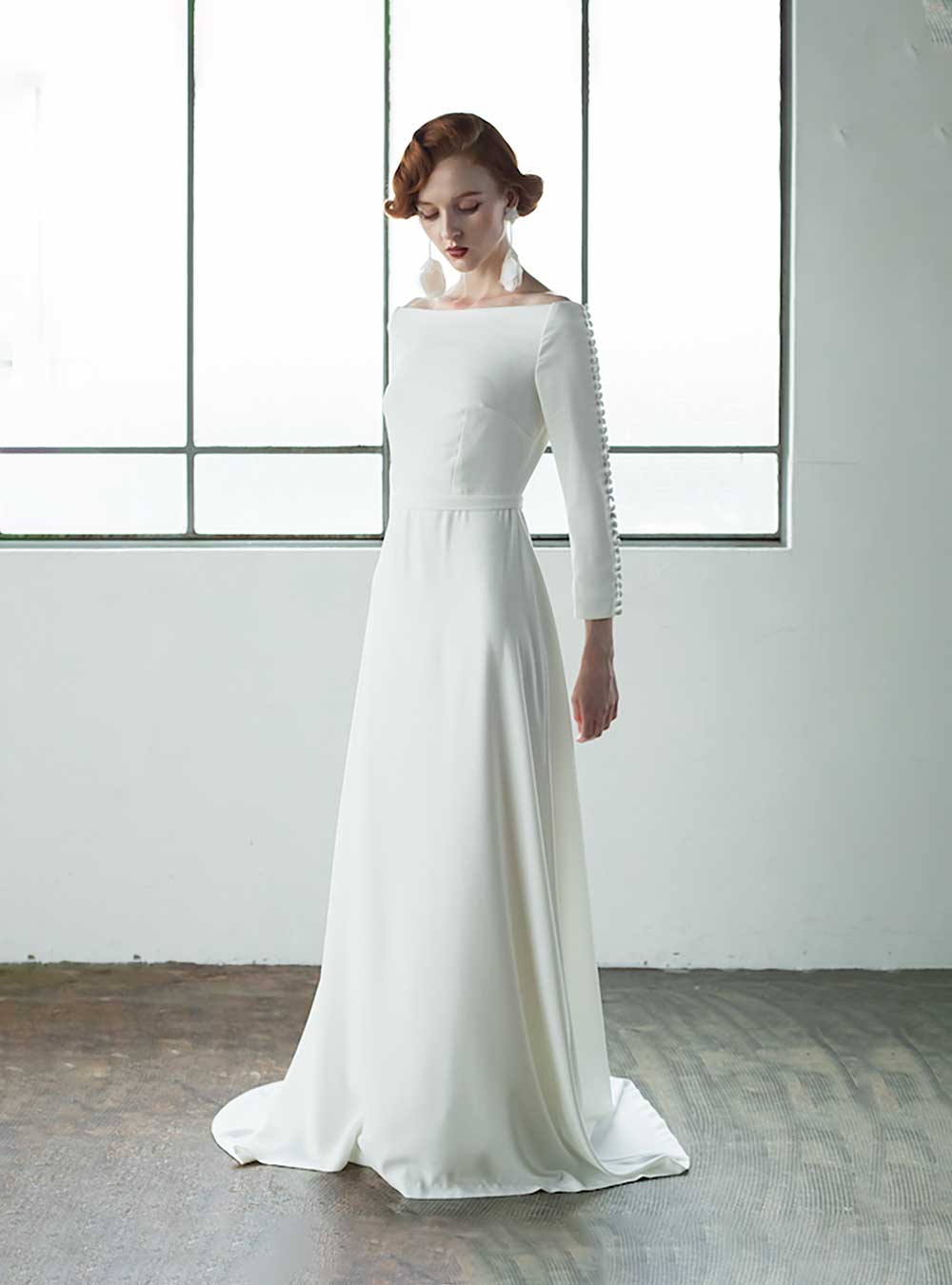 美しく気品溢れる一着でオフショルダースタイルの長袖ドレスです。デコルテと腕のラインを上品に引き立ててくれ、シンプルなデザインながらも袖にあしらわれたクルミ釦が控えめで上品なアクセントとなり、洗練された雰囲気を醸し出しています。どんなアクセサリーやブーケとも調和し、合わせ方次第で好みのコーディネートが完成します。