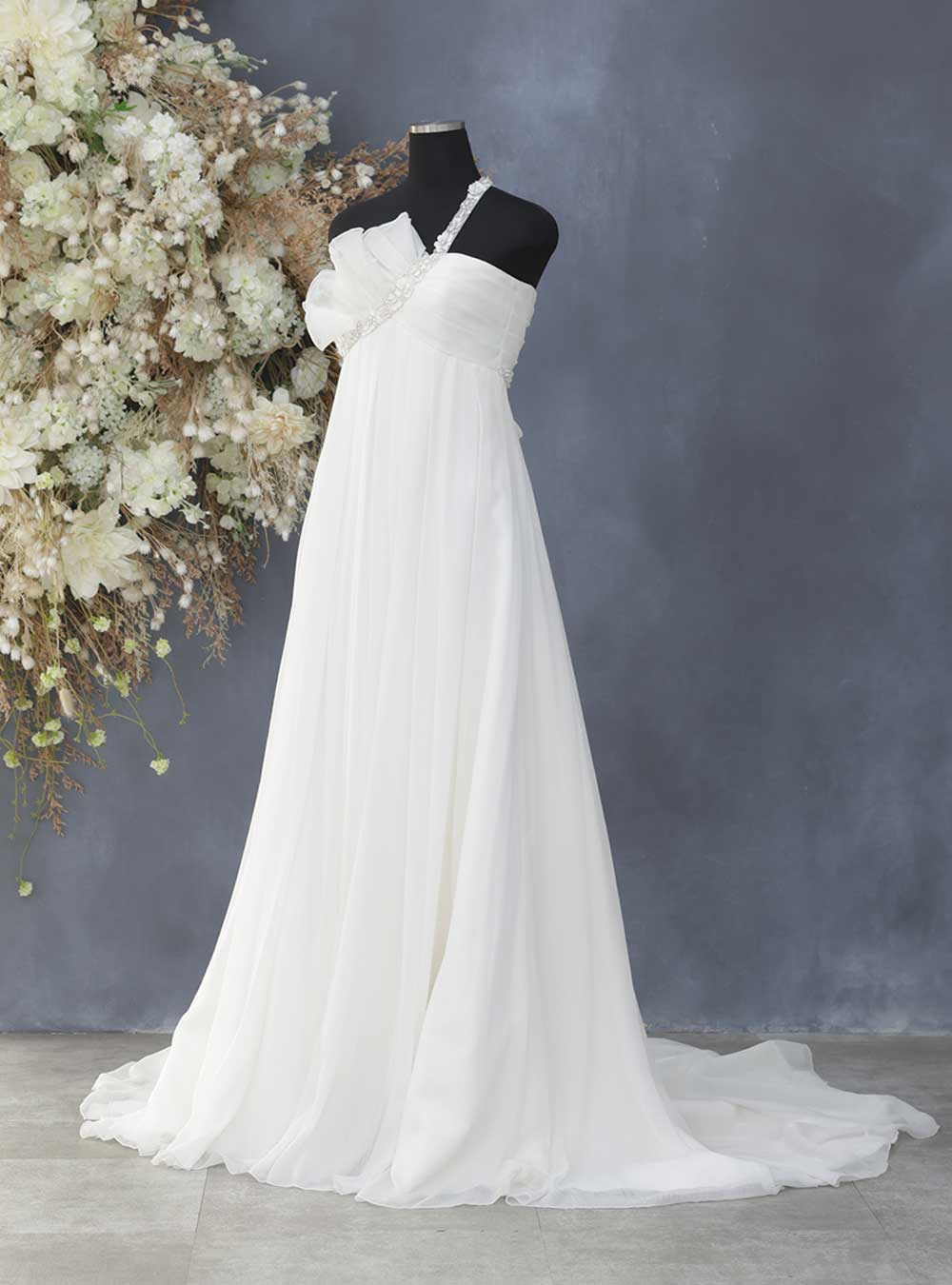 ワンショルダーにクロスギャザーとアシンメトリーなフリルでデザイン性の高いドレス。 そして裾に向かって広がるシルエットが美しいエンパイアラインシルエット。 エンパイアラインは、胸下からの切り替えがナチュラルな印象を与え、腰の位置を高く見せる事で脚長効果も期待できます。 マタニティーさんでも着やすいシルエットでもありますので、一度ご試着してみてください。 7号~9号サイズまでの対応です。