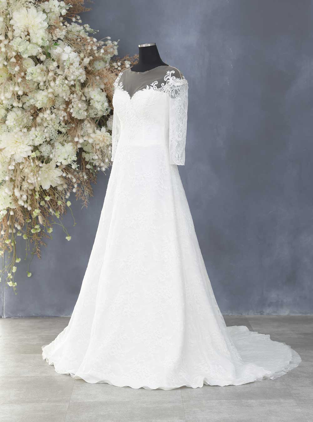 肌の露出をおさえて、上品に見せてくれる袖有りタイプのウエディングドレス。 クラシカルな雰囲気を演出できる他、気になる二の腕や脇のあたりも隠してくれるとこも選ばれるポイントになっています! また七分丈の袖は、華奢な部分が強調されカジュアルダウンできるのも魅力の一つ。 気品と親しみやすさを備えた大人花嫁を印象付けてくれることでしょう。 8号サイズのドレスです。