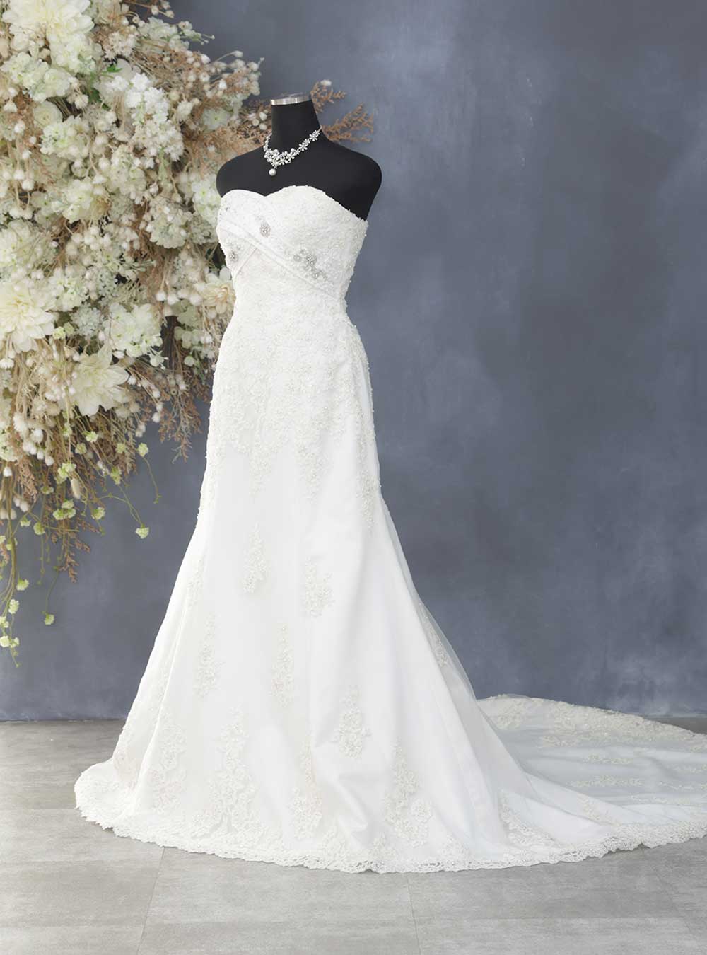 胸元のハートカットが特徴的な可愛いドレス。 トップスにはレースやビジューも施されており、シンプルなシルエットの中にも花嫁を輝かせるための工夫が盛りだくさん!顔回りを華やかに演出してくれます。 上品で大人なデザインの中に豪華さも兼ね備えたこちらのドレスは幅広い年齢の花嫁に人気のドレスです。 7号~11号サイズまでの対応です。