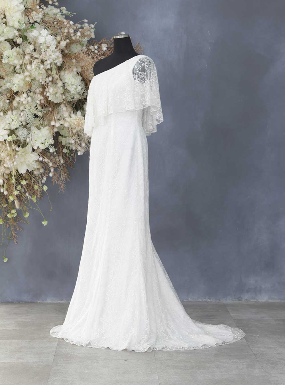 ワンショルダーでアシンメトリーなデザインが魅力のドレス。 柔らかなストレッチ素材を使用しており、着心地も抜群。 ソフトマーメイドタイプのドレスは、ボディーラインを強調し過ぎずスタイルアップ効果を発揮できるのが、花嫁に人気の秘訣!総レース生地を使用しているのでどの角度から撮影しても綺麗に撮影することができます。 11号サイズです。