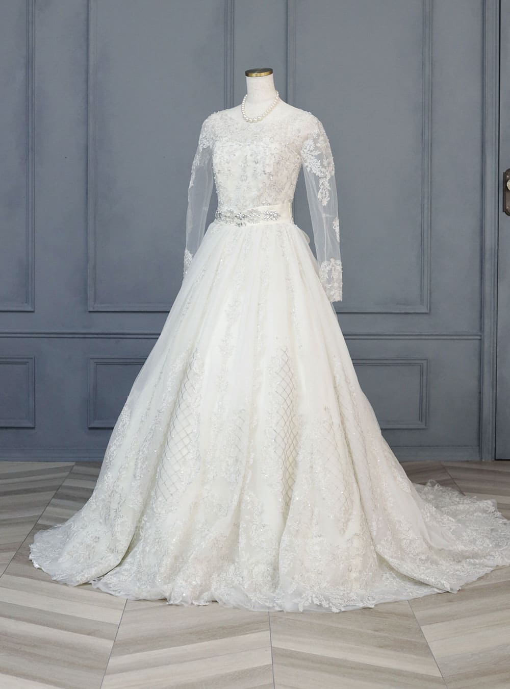 取り外し可能なインナーブラウスにはデザイン性の高いカットレースを施し、エレガントで華やかな印象を演出しています。 ロングスリーブで、肩や腕まわりが気になる方にもおすすめ。 目を引く豪華なビジューの施されたウエストベルトは、しっかりとウエスト位置を高く見せてくれます。 スカートにはアーガイルチェック柄の刺繍が装飾されているこだわりの詰まった1着。