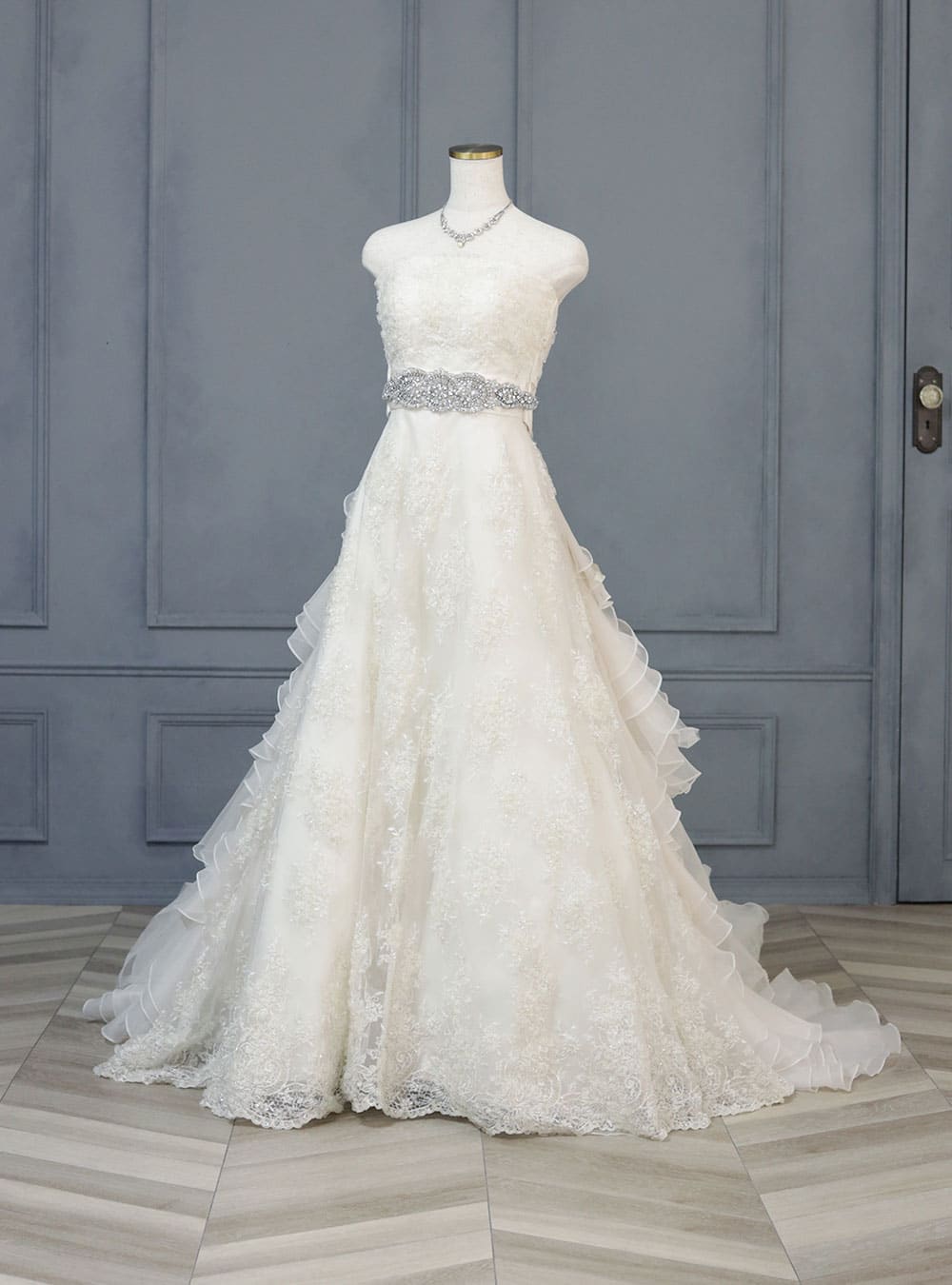 フロントは総レースで華やかなデザイン。バックは流れるようなフリルが豪華な後ろ姿になっている。 インパクトのある豪華なシルバービジュ―のベルトは、ウエスト位置を高めに見せてくれるスタイルアップ効果も発揮している。 ビジューベルトに合わせてシルバーのアクセサリーでコーディネートするのがオススメ!全体の統一感をアップさせてくれます。