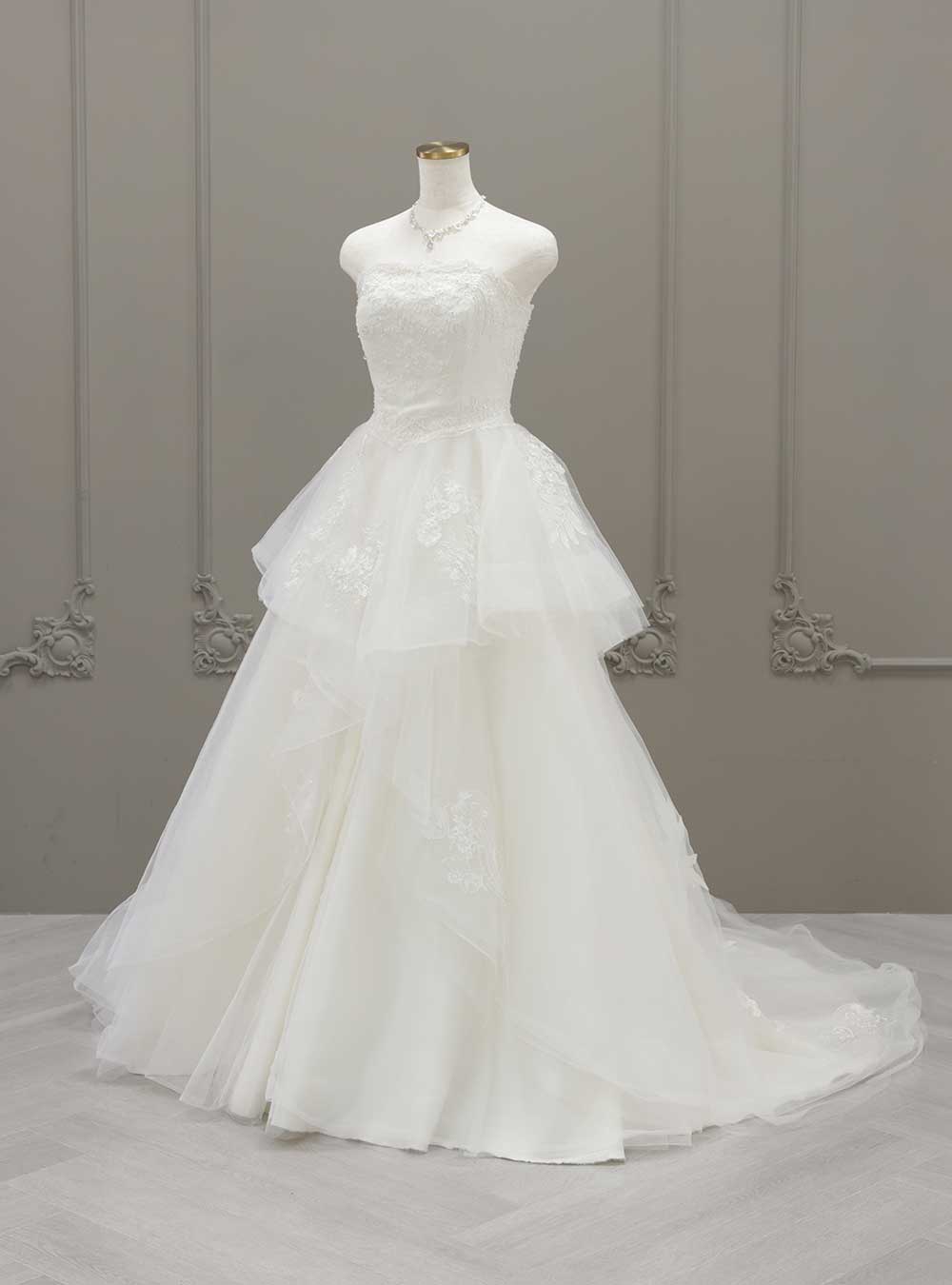 華やかに広がるボリュームたっぷりのシルエットが可愛いプリンセスラインのドレス。 も施されている。タイトなトップスと花嫁の動きに合わせて揺れ動く表情豊かなチュールスカートは可愛さだけでなく、クールで都会的な一面もありコーディネートが楽しめるデザインのドレス。