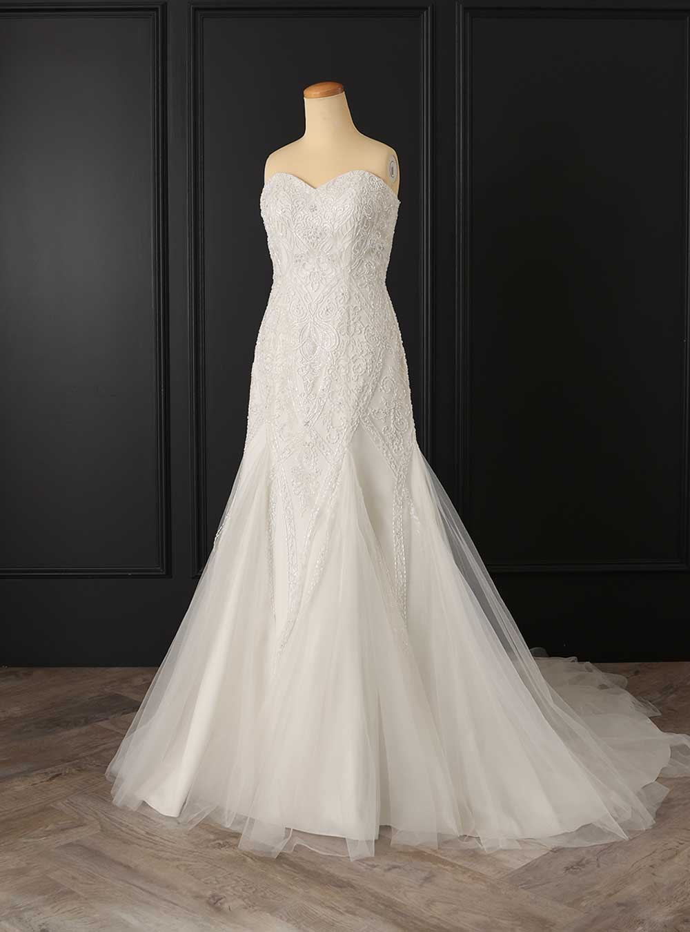 全身にビーズをあしらったスレンダーなドレス。スカートはスカートのうえにかぶるようなチュール素材が透明感を出しています。スカート後部のチュールには、立体フリルが透けて見え印象的です。ヒップにかけて通常よりも絞ったシルエットで女性の美しいラインを際立てます。大人っぽいのがいいけど可愛いニュアンスもほしい!という方にはおすすめのウエディングドレスです。