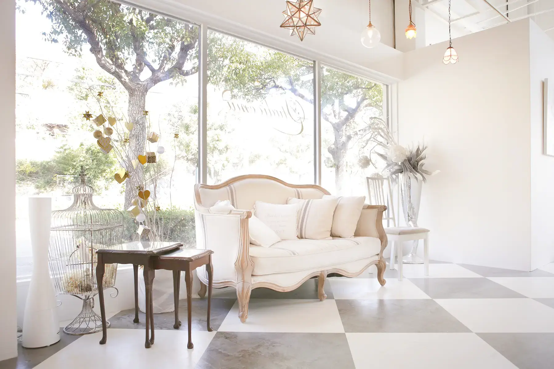 大きな格子窓にかかる白の花々は、造花とドライフラワーのミックスで華やかさを演出。背景の壁は、何度も塗装を重ねてエイジング加工を施し深い味わいのある壁面に。