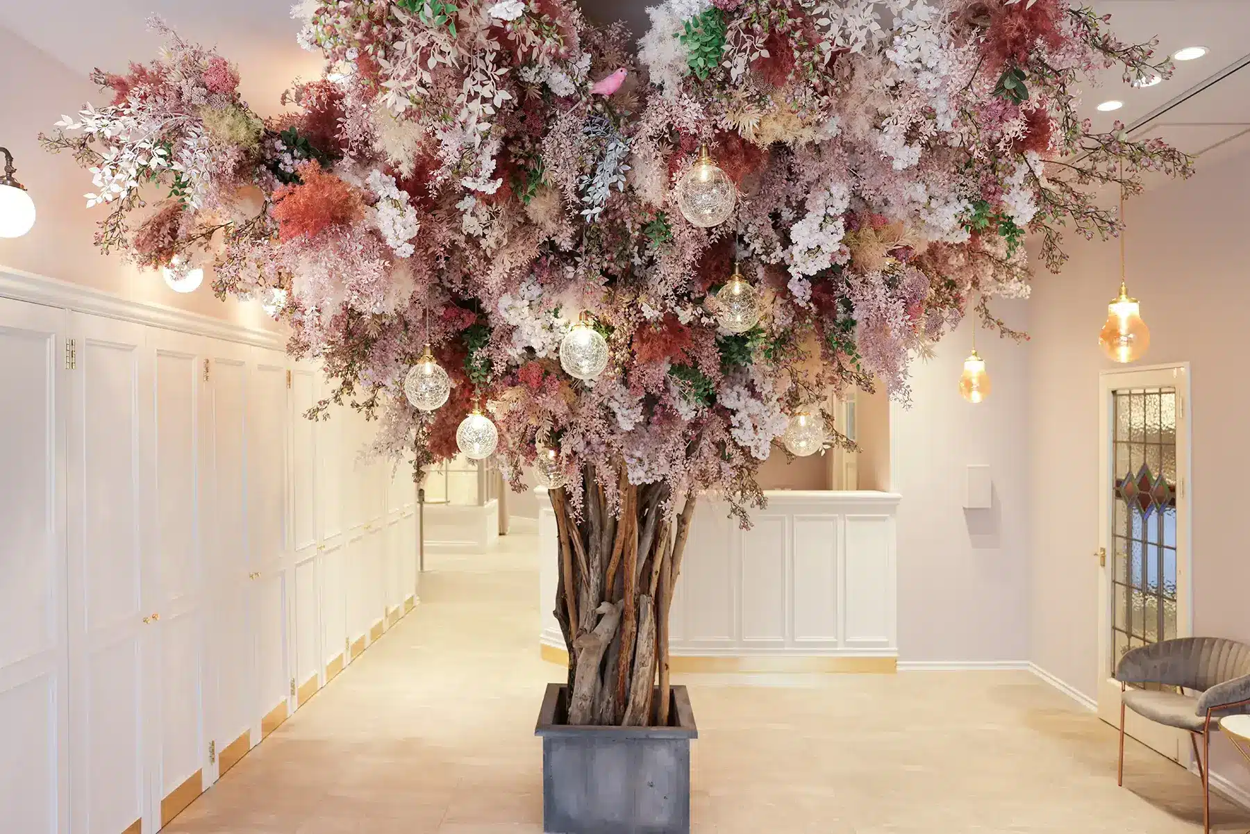 エントランスのドアを開けると大きなシンボルツリーがお出迎え。本物の流木に可愛いピンクのお花が咲いています。