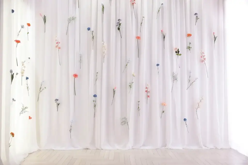 白いカーテンに色とりどりの花がランダムに散りばめられているシンプルながらもエレガントな背景です。