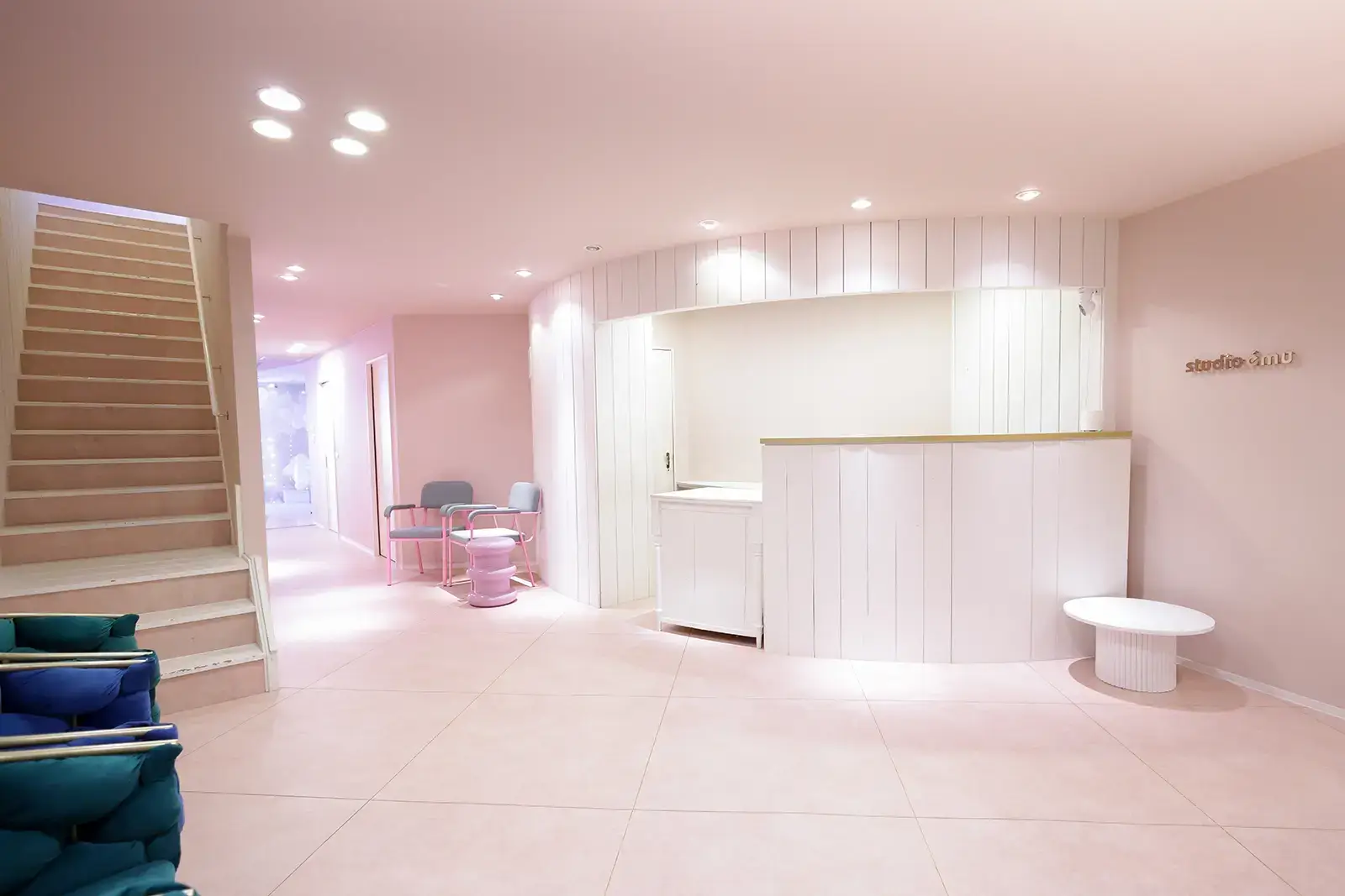 ピンクのカーブウォールと光窓はまるで海外の美術館のような雰囲気。段差にすわったり寝転がってみたり、自由に動いて自然な表情を引き出します。